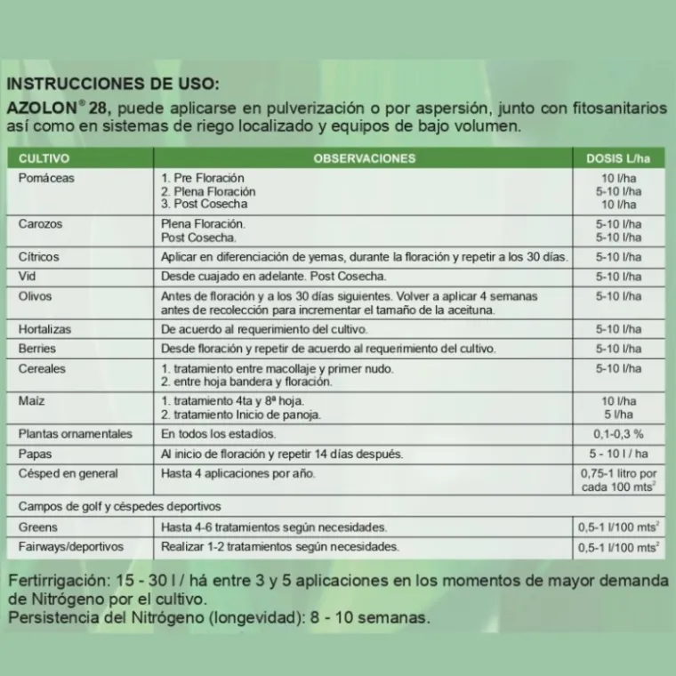 Campos de golf y césped deportivo: entre 0,5 y 1 litro de azolon cada 100m2 - entre 2 y 6 aplicaciones al año según necesidad y uso.