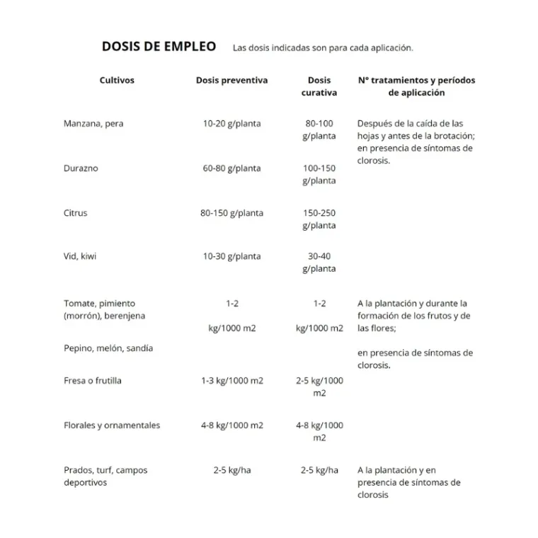 Aplicado al suelo en proximidad de las raíces o mediante riego, previene y corrige la clorosis férrica suministrando de forma rápida y persistente la cantidad de hierro indispensable para el crecimiento de las plantas.