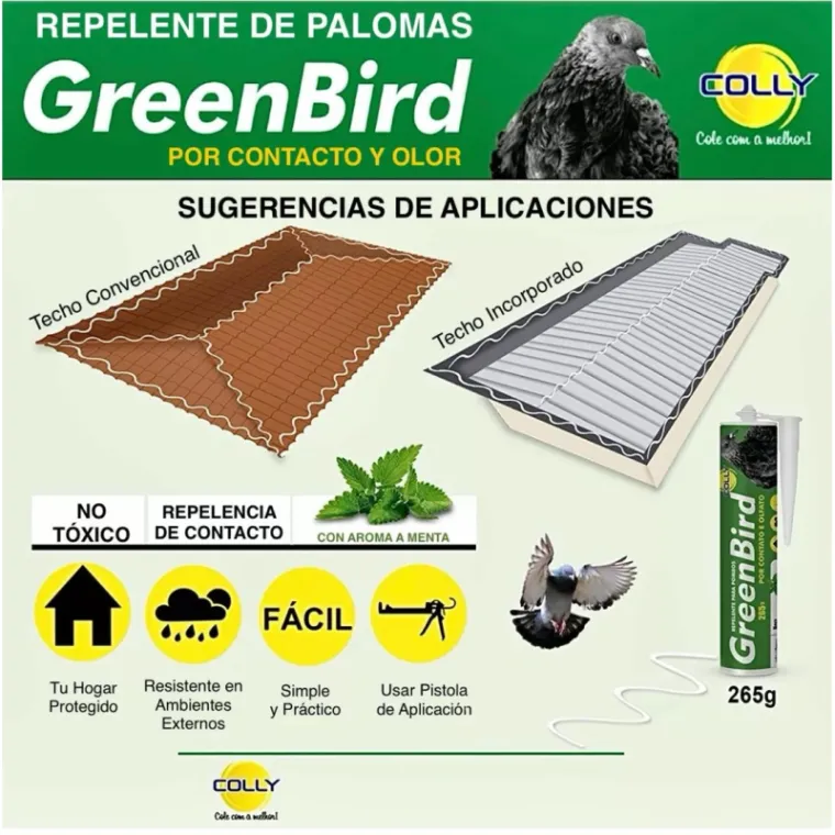 GREENBIRD el repelente profesional para palomas de alta eficiencia de Laboratorio Colly (Brasil). Ahuyenta palomas y murciélagos.